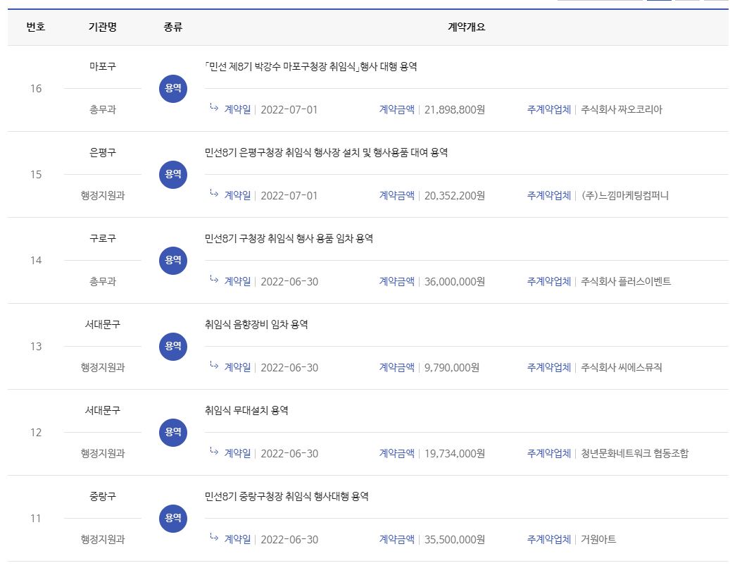 계약 업체 역시 홈페이지와 이력 등을 갖추어 검색으로 충분히 검증 가능한 경우가 있는 반면 사무실조차 없거나 빌라가 주소지로 나와 있는 업체도 있었다. 일례로 중랑구의 경우 500명 규모의 대형 취임식을 3700만원을 들여 구민회관에서 진행했다.