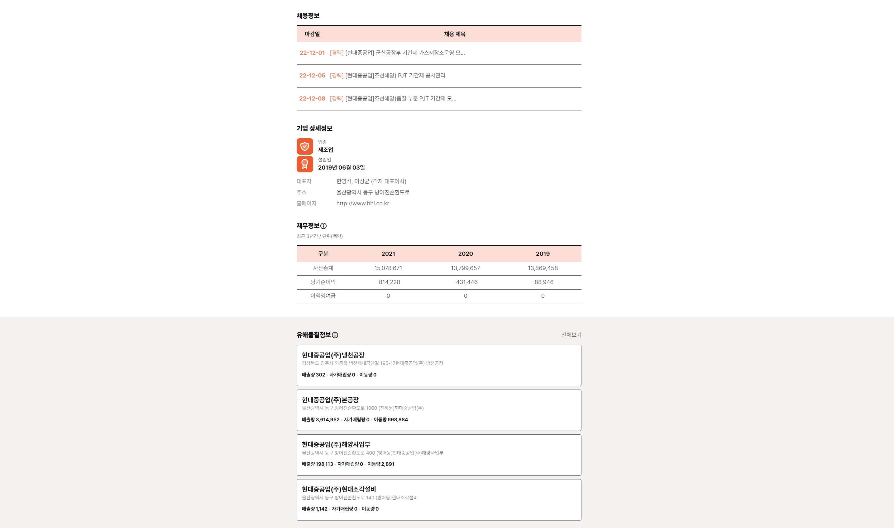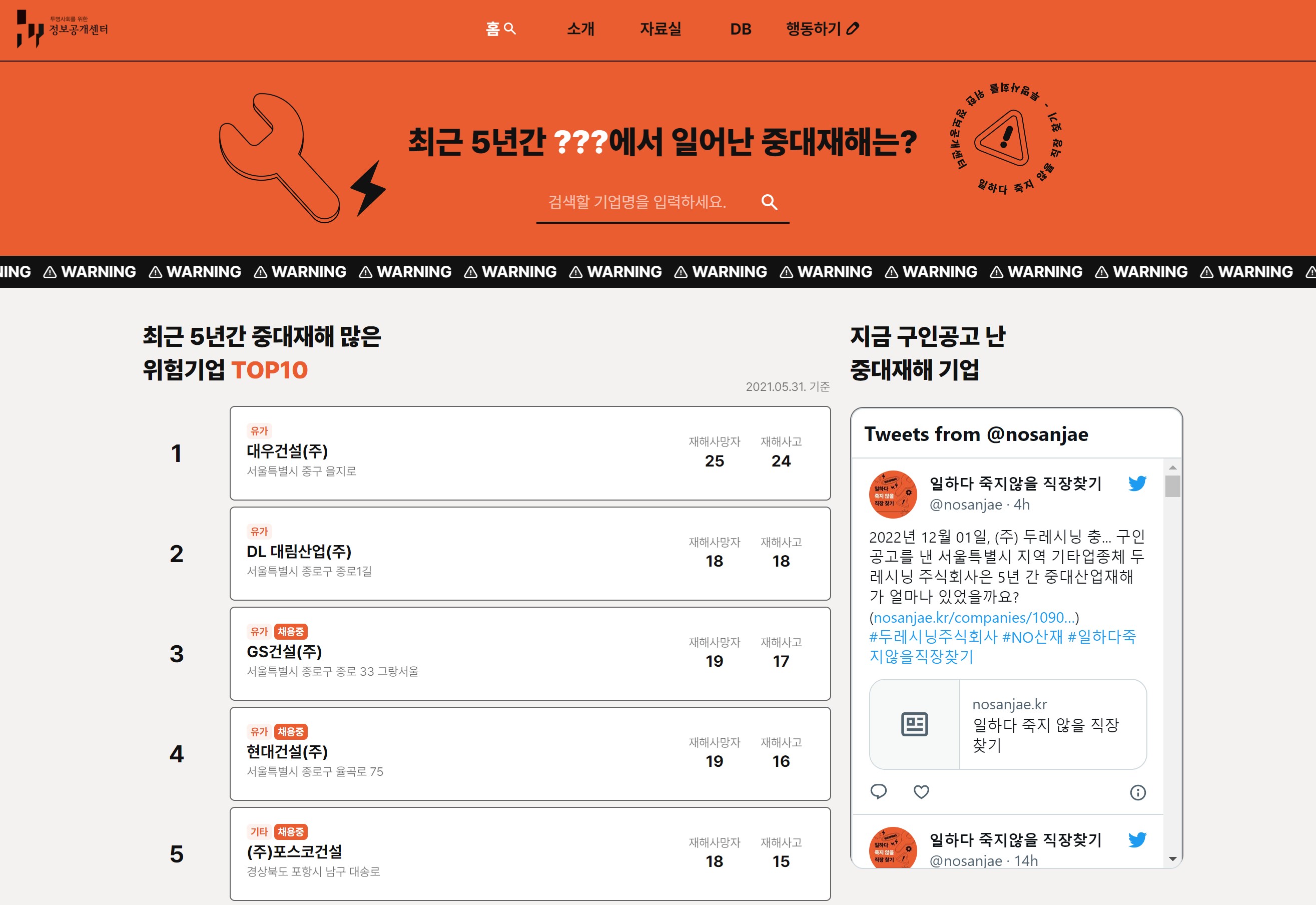 일하다 죽지않을 직장찾기는 기업의 이름을 검색하면, 해당 기업에서 일어난 최근 5년 간의 중대재해 내역과 사업장의 유해물질 취급 현황 정보, 해당 기업의 채용정보 등을 확인할 수 있는 웹사이트입니다. 그뿐 아니라 워크넷의 구인공고 API를 이용하여, 매일 새로운 구인공고를 올린 기업의 정보를 트위터 계정에서 공개하여 해당 기업의 최근 5년 간 산업재해 사망 사고 현황 정보를 확인할 수 있도록 했습니다.