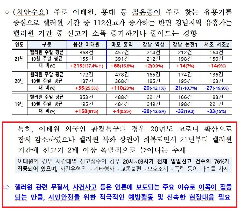 또한 서울청에서 작성한 '핼러윈데이' 치안여건 분석 및 대응방안 보고 문서에 따르면, 이태원 관광특구에 112신고가 2배 이상 급증할 것을 이미 예측했고 사건 유형 역시 기타형사, 교통불편, 보호조치, 폭력 등으로 분석되어 교통기동대 외에도 현장의 경비인력 지원이 필요한 상황이라는 것을 충분히 가늠할 수 있었다.
