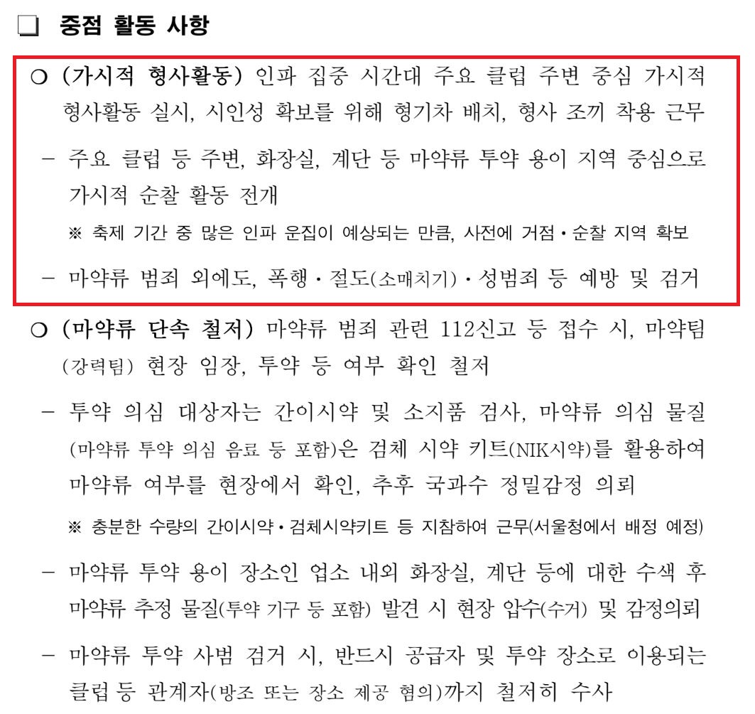 11월 5일 경찰청 등이 이성만 의원실에 제출한 '핼러윈 데이(10. 31.) 축제 기간' 마약류범죄 단속예방을 위한 특별형사활동 문서를 살펴보면, 참사 당일 이태원에서는 52명의 형사가 관내 클럽 등 유흥업소 밀집 지역 중심 순찰 활동 등을 하는 것으로 계획되었다. 계획에서는 '가시적 형사활동'을 중점으로 인파 집중 시간대 주요 클럽 주변에 형사기동차량을 배치하고 형사 조끼 착용 근무를 지시했다.
