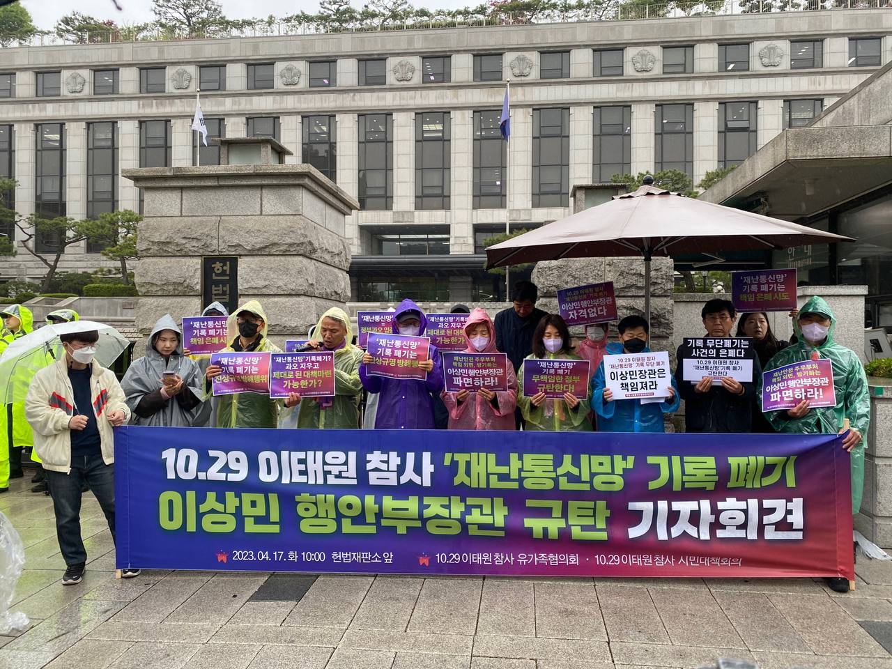 - 이에 10.29 이태원 참사 유가족협의회와 10.29 이태원 참사 시민대책회의는 4/18(화) 오전 10시, 헌법재판소 앞에서 이상민 행안부장관 탄핵심판 준비기일을 즈음해 행정안전부의 무책임한 ‘재난통신망’ 기록 폐기를 규탄하고, 이상민 행안부장관의 책임이 무겁다는 점을 알리고자 규탄 기자회견을 개최하고자 함.