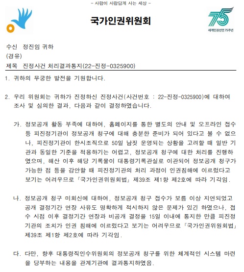따라서 접수의 기준은 정보공개센터가 우편 등기로 발송한 정보공개청구서가 인수위에 도착한 2022년 3월 22일부터 기산되어야 한다. 그런데 인권위는 인수위가 지연하여 접수한 날인 4월 5일부터 처리 기간을 계산해 인권침해가 발생하지 않았다고 판단했다. 접수 지연으로 인해 법정 처리기간보다 10일이나 지나서야 결과가 나왔고 결국 인수위 해단식이 진행된 5월 6일 정보를 비공개한다는 결정 통지서를 받을 수 있었다.
