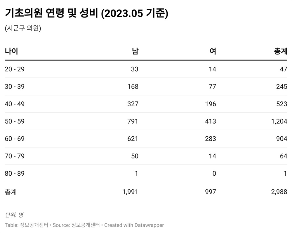 본격적인 분석에 앞서 지방의원들이 어떤 사람들로 구성되어 있는지 기초적인 성별, 연령 통계를 내보았습니다.