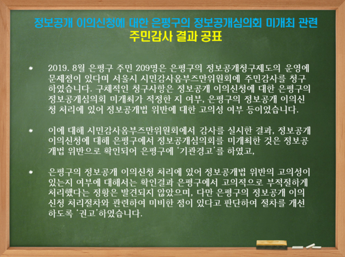 2020년 4월 24일, 서울시 옴부즈만 위원회의 감사 결과가 발표되었는데요, 은평구가 2년 간 정보공개심의회를 개최해야 하는 77건의 이의신청에 대해 심의회를 미개최하였다는 사실이 밝혀졌습니다. 서울시 옴부즈만 위원회는 이러한 부적절한 처리에 고의성이 있다기 보다는, 각 처리부서가 자의적으로 심의회 개최 여부를 결정하다보니 생긴 문제로 판단하고 은평구청에 '기관 경고' 처분을 하면서, 정보공개 이의신청 처리 절차를 개선할 것을 권고하였습니다.