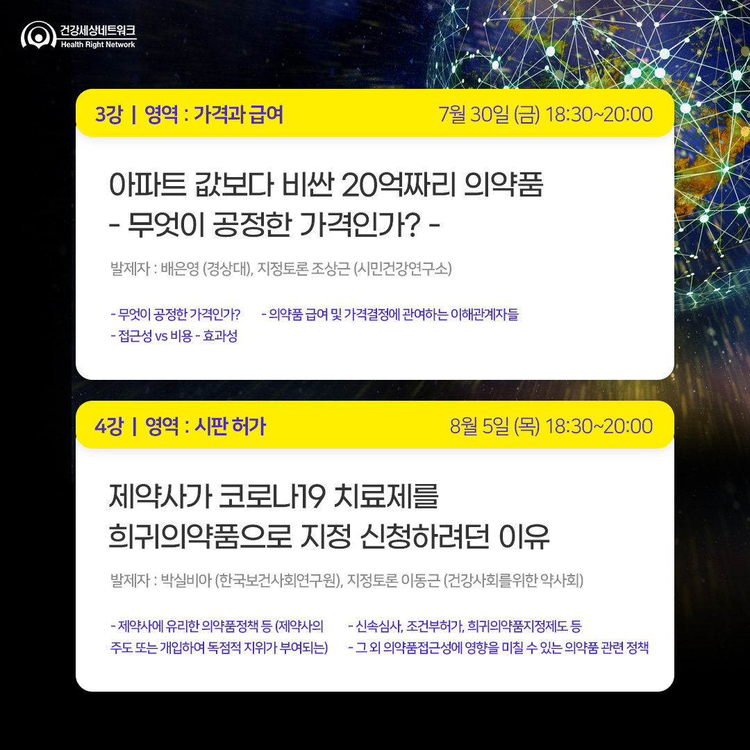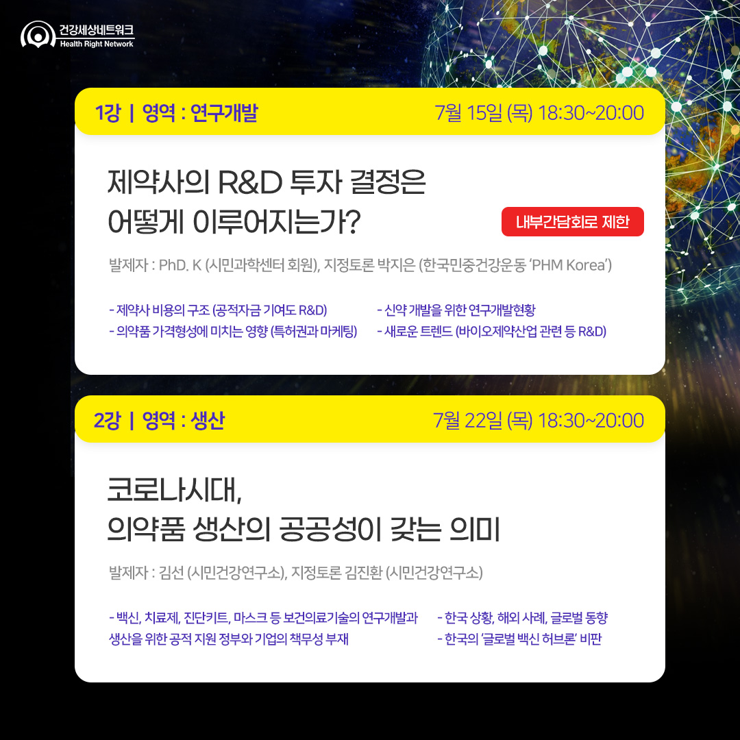 코로나19라는 유래없는 팬데믹과 함께 백신 및 치료제를 누가 언제 맞을 수 있느냐가 모두의 화두가 되었습니다. 오래 전 부터 의약품의 개발과정, 가격이 공중의 보건권에 미치는 영향에 대해서 시민사회와 전문단체들의 고민과 투쟁이 있어왔지만, 반복되는 감염병으로 인한 공중보건위기와 빅데이터 및 AI에 의한 고가의 의약품 및 의료기술 개발을 맞이한 지금, 그 어느때보다 함께 의약품 접근권에 대해 고민하고 지혜를 모으는 것이 필요합니다.